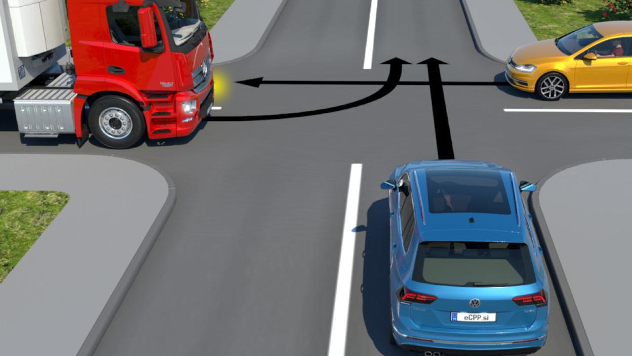 Žuti i plavi automobil na ovoj raskrsnici idu pravo, dok kamion skreće ulevo. Kojim redosledom vozila prolaze kroz raskrsnicu?