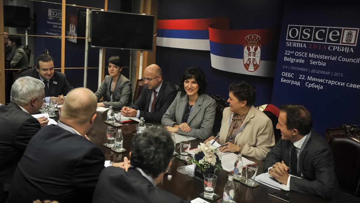 Sastanku koji Dačić ima sa proširenim Biroom Parlamentarne skupštine OEBS prisustvovala je i predsednica skupštine Maja Gojković.