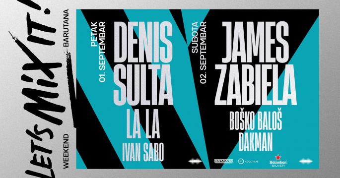 Let’s Mix It! Weekend biće održan 1. i 2. septembra u Barutani na Kalemegdanu, a ovogodišnji program predvode najtraženiji svetski izvođači - miljenik beogradske publike, maestralni DJ i producent Denis Sulta, legenda britanske elektronske scene James Zabiela i DJ-ica La La. Za domaću podršku zaduženi su pobednik ovogodišnjeg Let' Mix It! takmičenja Boško Baloš, finalista ovogodišnjeg takmičenja Ivan Sabo, kao i prošlogodišnji pobednik Let' Mix It! takmičenja - Dakman.
