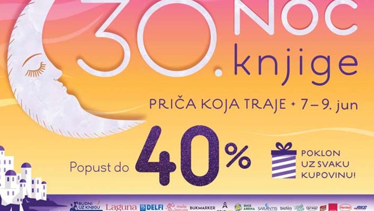 Omiljena manifestacija svih koji vole knjigu i čitanje, jubilarna 30. Noć knjige održaće se od 7. do 9. juna 2024. godine u knjižarama Delfi i Laguninim klubovima čitalaca u Srbiji i regionu, kao i na sajtovima laguna.rs i delfi.rs.