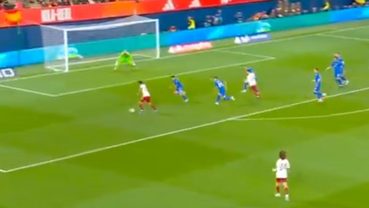 U 17. minutu, Fermin Lopes je poslao loptu ka fudbaleru Real Sosijedada. Mogao je do nje Baena, ali ju je majstorski propustio kroz noge do saigrača.