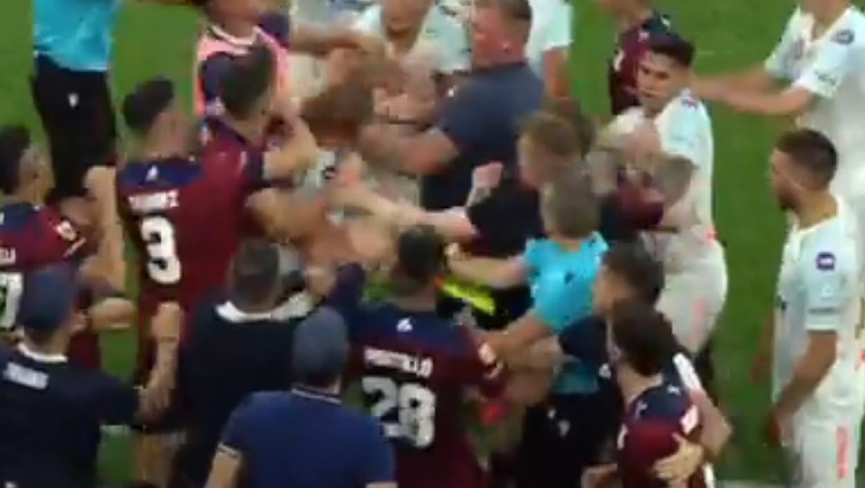 Situacija i nervoza je eskalirala u samoj završnici susreta. Do sukoba igrača dveju ekipa je došlo kraj same aut linije, a opšti haos se preselio na celi teren. Sevale su pesnice, udarci i guranje, fudbaleri su padali, ali odmah ustajali i nastavljali da učestvuju u incidentu.