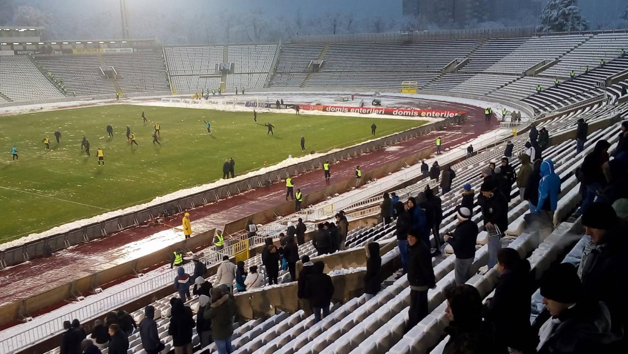 Derbi 20. kola Superlige Srbije, između fudbalera Partizana i Vojvodine igra se u Humskoj, a početak meča obeležio je sneg. Trebalo je da utakmica počne u 15 časova, ali je zbog uklanjanja snega sve počelo sat kasnije. Na tribinama u Humskoj nije bilo mnogo navijača, a pojedini koji su došli gađali su goste grudvama.