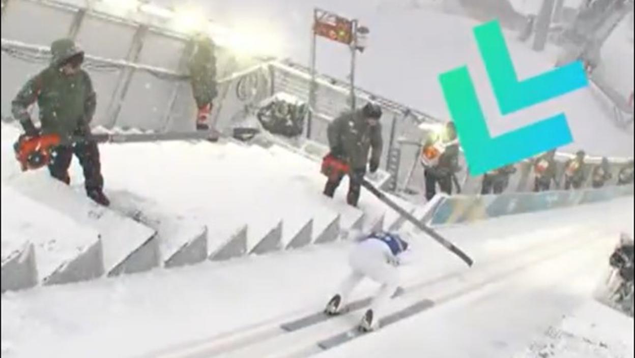 Član osoblja na skakaonici ostavio je mašinu za duvanje lišća na zaletištu, pa je izgledalo kao da će se Lumis zabiti u nju u punoj brzini.