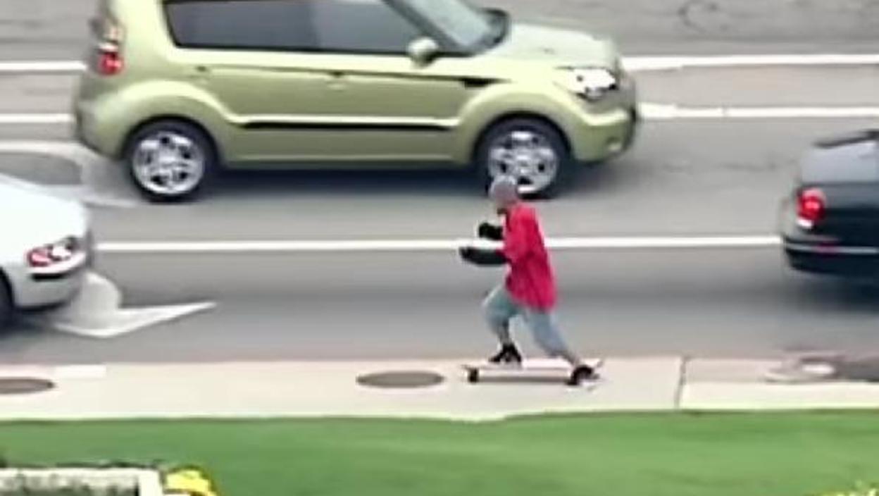 После бекства украденим аутомобилом при брзини од 144 км на сат, осумњичени се сударио насред улице. Затим је снимљен како излази из аута са скејтбродом у рукама, бежећи прво пешке, а затим и покушавајући да искористи ово приручно возило.