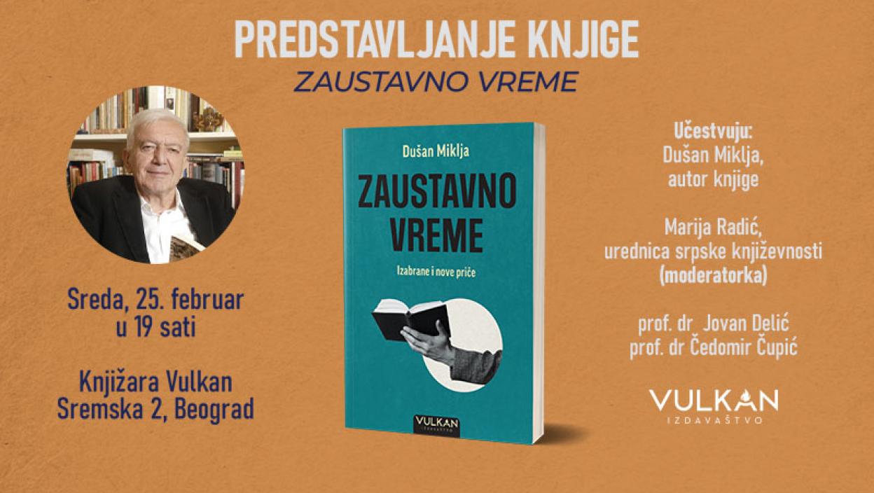 Вулкан књижаре позивају вас на представљање најновијег издања једног од најзначајнијих српских путописаца, новинара и књижевника Душана Микље, књиге Зауставно време: Изабране и нове приче, које ће бити одржано у књижари Вулкан у Сремској 2 у Београду, у среду, 25. фебруара, са почетком у 19 часова.
