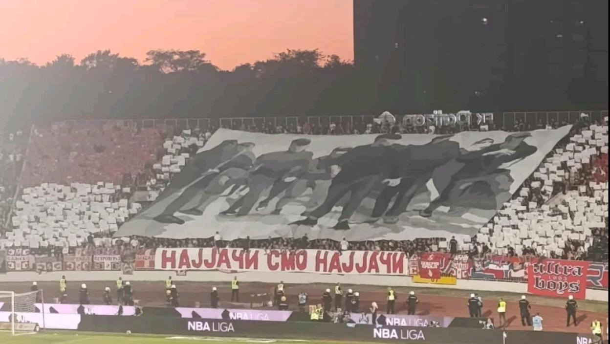 Пред сам почетак вечитог дербија, најватренији навијачи Црвене звезде, Делије су развиле и кореографију на северној трибини стадиона преко целог тог дела.