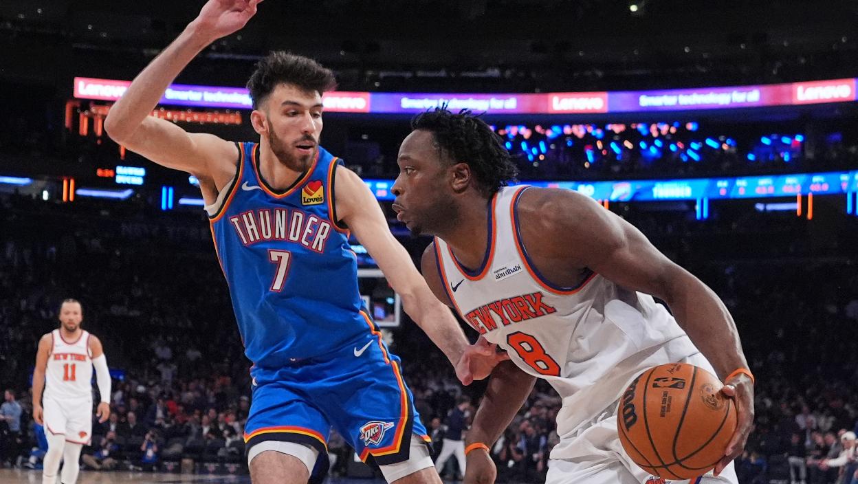 Актуелни шампиони НБА лиге, Оклахома Сити Тандери славили су на гостовању Њујорк Никсима (103:100).