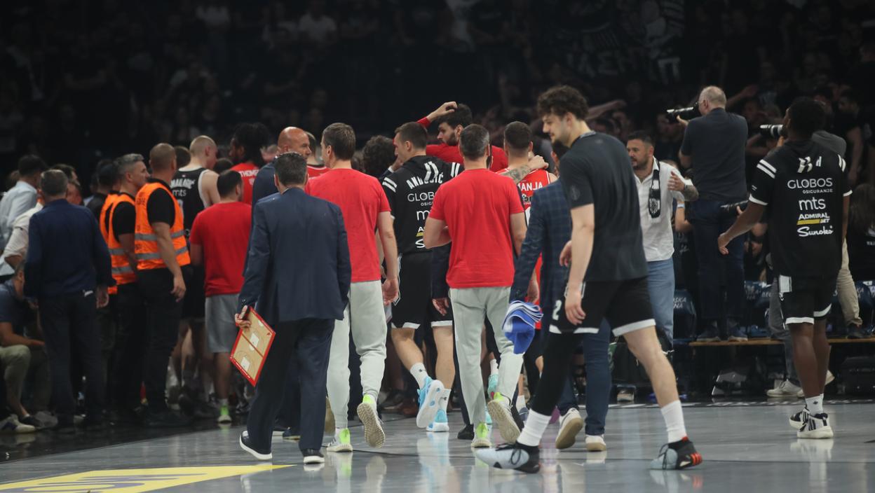 Кошаркаши Црвене звезде су напустили терен због вређања у другој финалној утакмици Суперлиге Србије при резултату 57:45 за Партизан.
