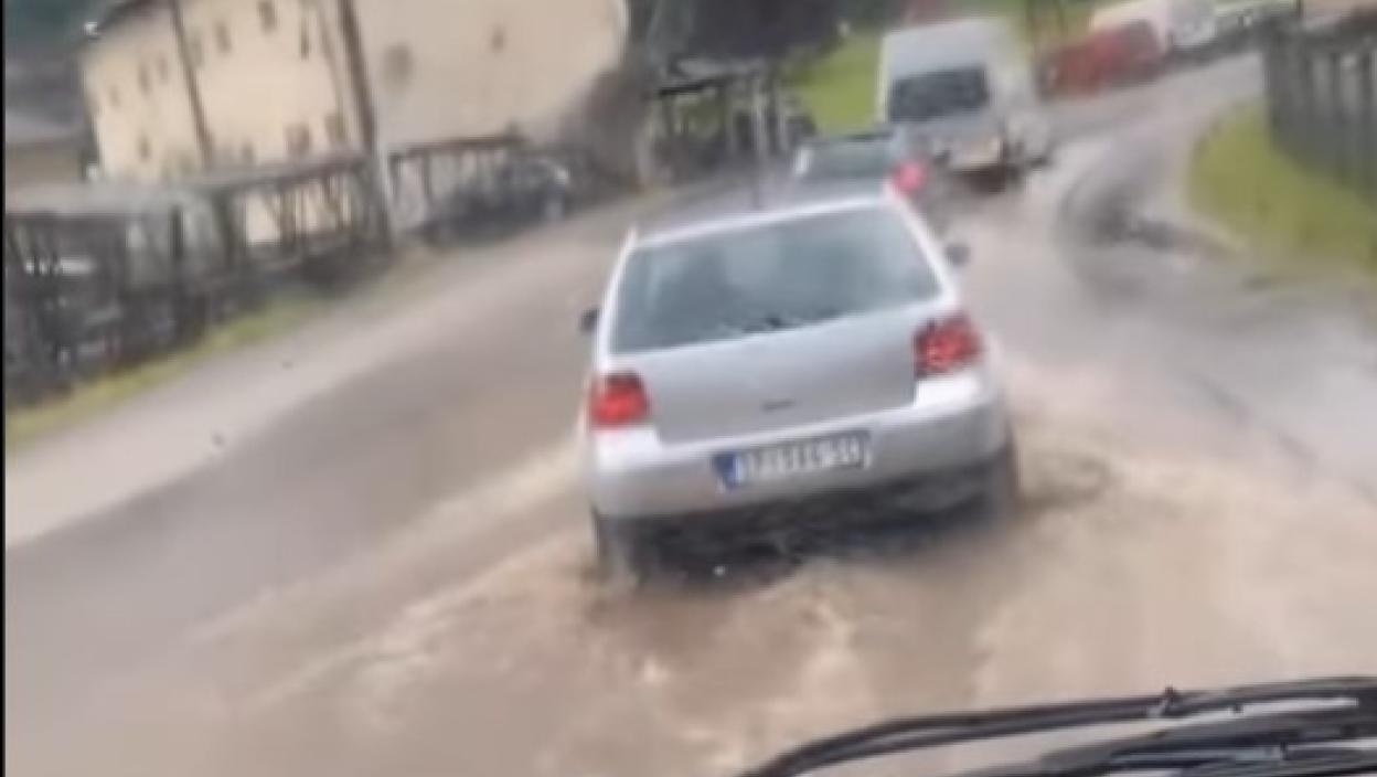 Потоци се сливају низ асфалт, а возила која су у саобраћају су добрим делом прекривена водом.