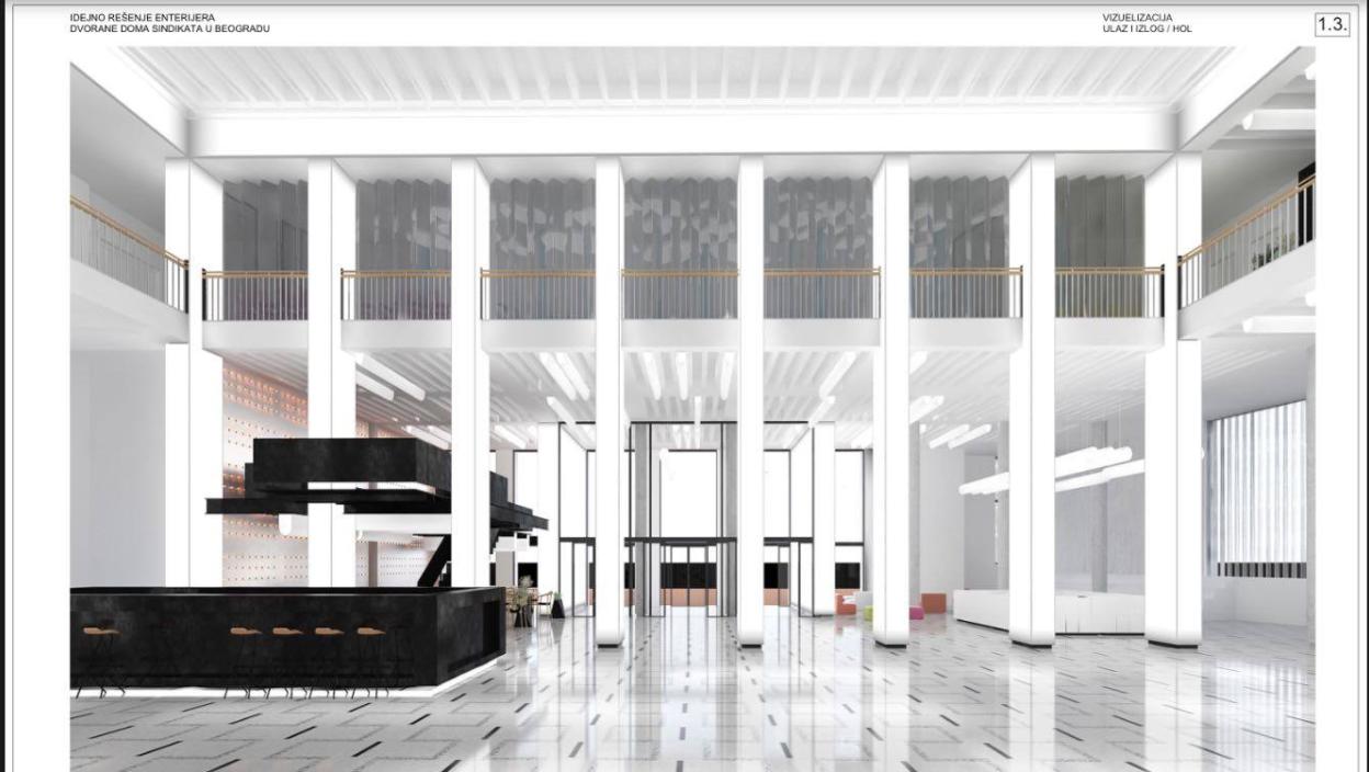 - За прес центар, галерију, дечји едукативни кутак са играоницом резервисан је први спрат, док ће бар бити у великом холу у приземљу са летњом баштом истуреном ка Тргу Николе Пашића. Из хола ће, осим степеница, до првог спрата водити и лифт, а реконструисани Дом синдиката биће отворен од 10 сати до један час после поноћи, рекао је Станковић. Биће запослено 120 радника, додао је Станковић.