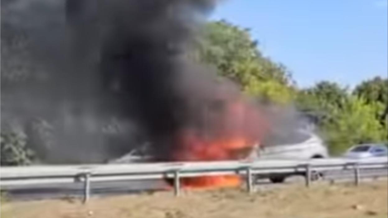 Како се види на објављеном снимку, ватра гута џип, а црни густи дим се шири, а ситуацију погоршава ветар.
