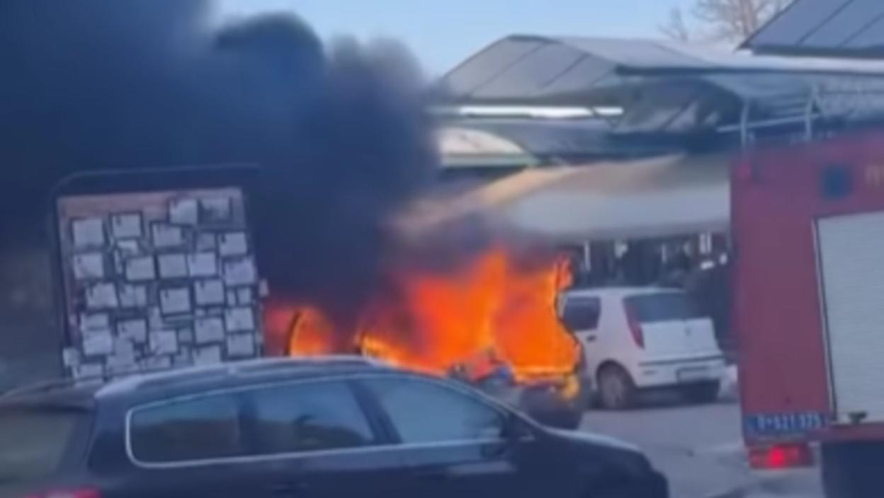 Пламен је у року од неколико минута у потпуности захватио задњи део возила, а густ црни дим ширио се овим делом града.