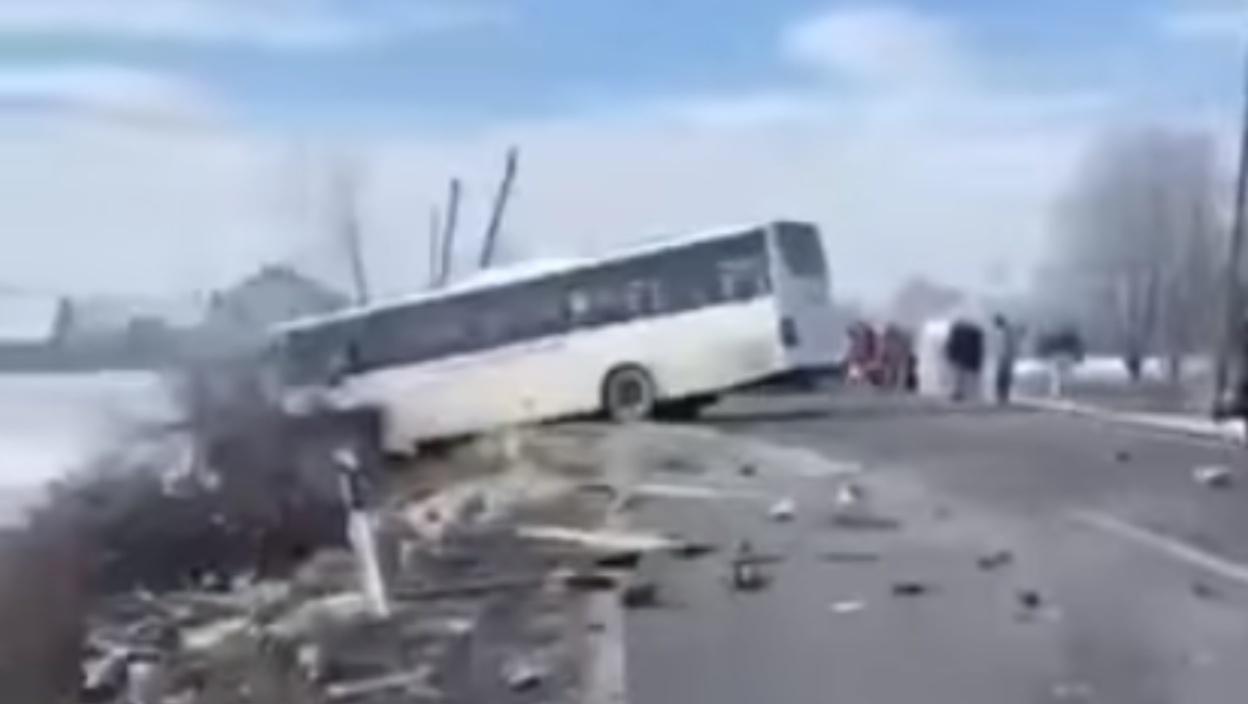 На снимку се види аутобус који је слетео са пута и камион који је у потпуности уништен. Делови возила су разбацани по путу.