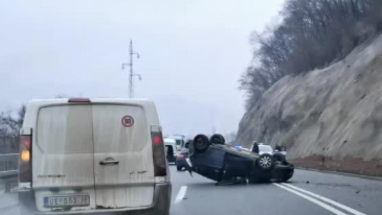 Саобраћај је на том делу путу успорен, а возила из леве и десне траке наизменично заобилазе преврнут ауто.
