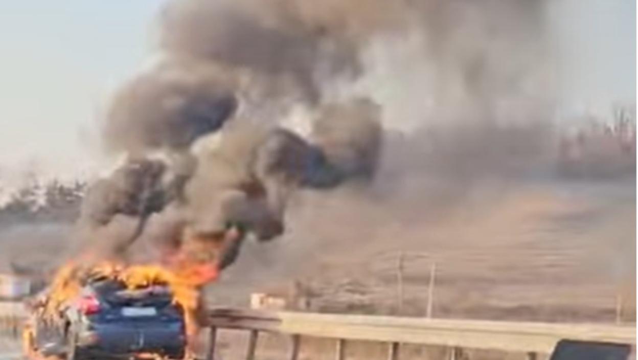 Једно путничко возило је у потпуности захватио пламен, а како можете видети на снимку који објављујемо, густ црни дим се надвија над овом саобраћајницом.