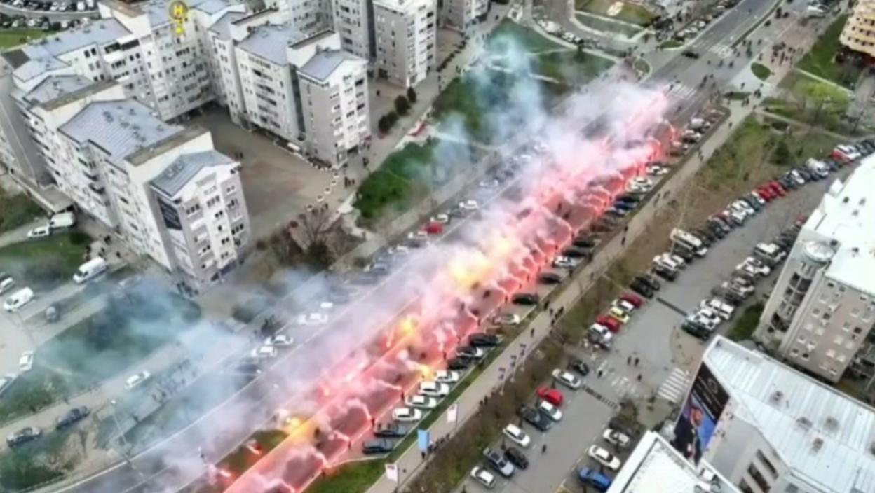 Од кружног тока ка Београдској арени, присталице су упалиле бакље док су чекали да председник прође према Београдској арени.