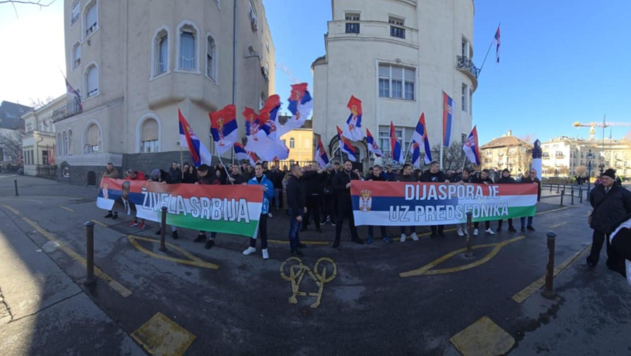 "Дијаспора је уз председника" Скуп подршке председнику Вучићу одржан испред амбасаде Србије у Будимпешти
