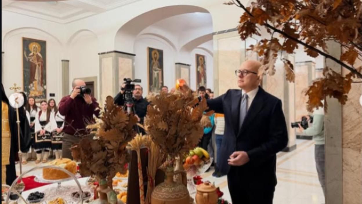 (ФОТО) Милош Вучевић унео бадњак у зграду Председништва и пожелео честитке поводом Бадњег дана