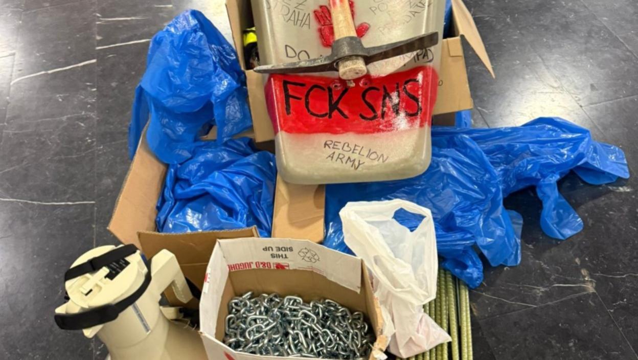 Полиција је у канцеларијама пронашла секире, ножеве, кациге, металне и дрвене палице, бакље, петарде, топовске ударе, па чак и мацоле и пољопривредне алатке – све припремљено и коришћено за насилне нападе на полицију и државу.