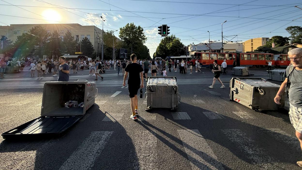 Ситуација код Вуковог споменика вечерас је потпуно ван контроле! Група блокадера направила је потпуни хаос — преврнути су контејнери, постављене импровизоване барикаде, а улице су практично забарикадиране.