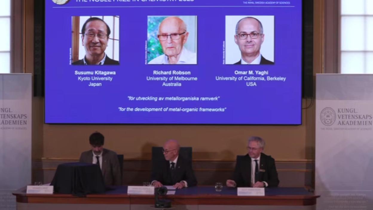 Нобелова награда за хемију додељена је данас научницима из Јапана, Аустралије и Сједињених Америчких Држава, Сусуму Китагави, Ричарду Робсону и Омару М. Јагију, за развој "метално-органских оквира", саопштила је Краљевска шведска академија наука.