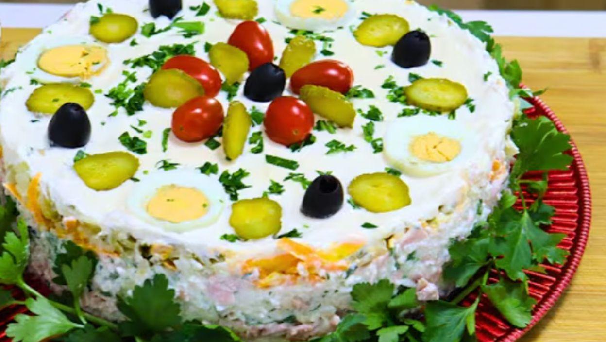 Припрема: Скуван пиринач помешајте са везом першуна, сецканим јајима и паризером и павлаком. Пола од те смесе је први слој који стављате у калуп за торту. Затим преко ставите слој мајонеза, рендан кромпир, рендану шаргарепу, першун и мало шунке, па опет слој пиринча и тако док не потрошите материјал. Затим све украсите слојем мајонеза, чери парадајза и маслина.