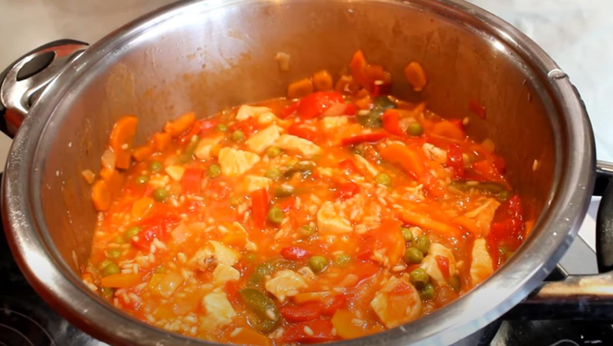 Умешати алеву паприку, додати пржено месо и зачинити сољу, бибером и ловоровим листом. Сипати воду или бујон, поклопити и оставити да се крчка на тихој ватри 20-30 минута, док пиринач упије течност и постане мекан.