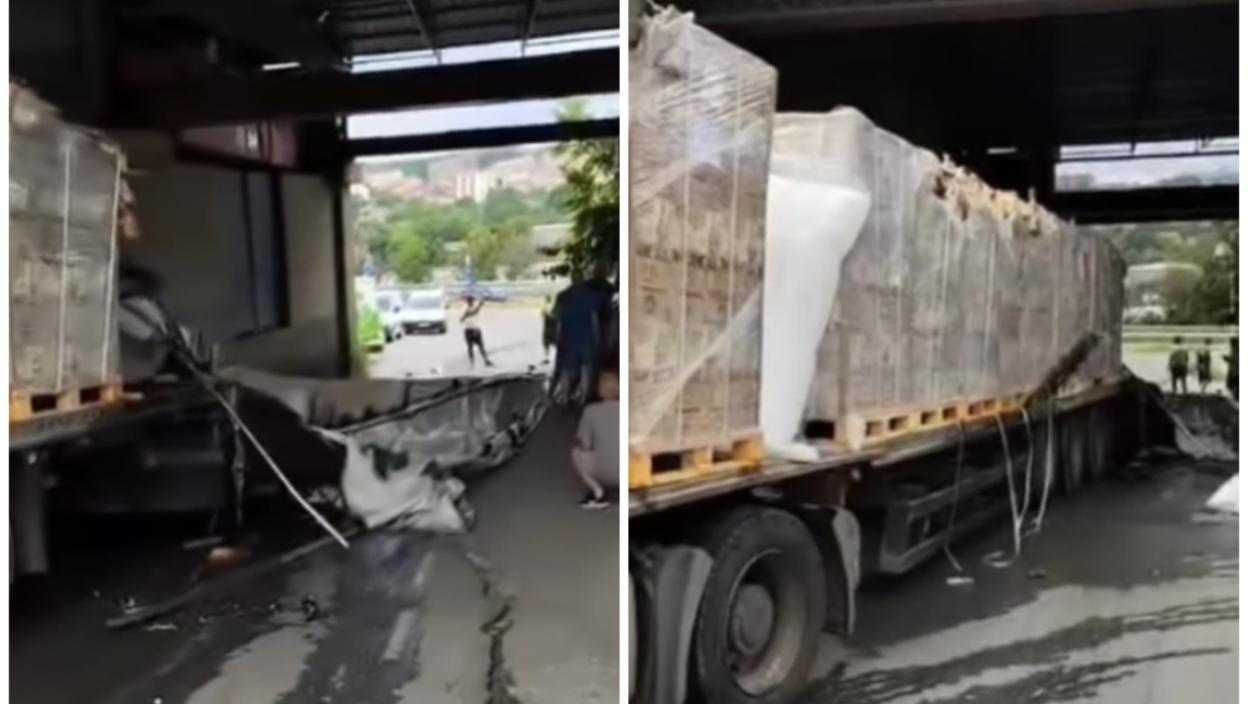 Nesreća se dogodila u Malom Mokrom Lugu kod silaska na autoput, a kako se može videti u snimku, kamion koji je prevozio robu potpuno se raspao nakon što je pokušao da prođe ispod nadvožnjaka.