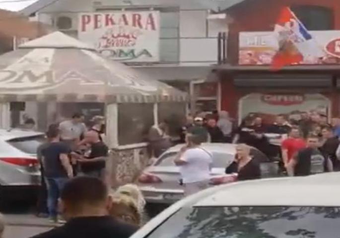 Okupljeni skandiraju parole o Kosovu, a vlasnici pekare zatvorili su se unutra.