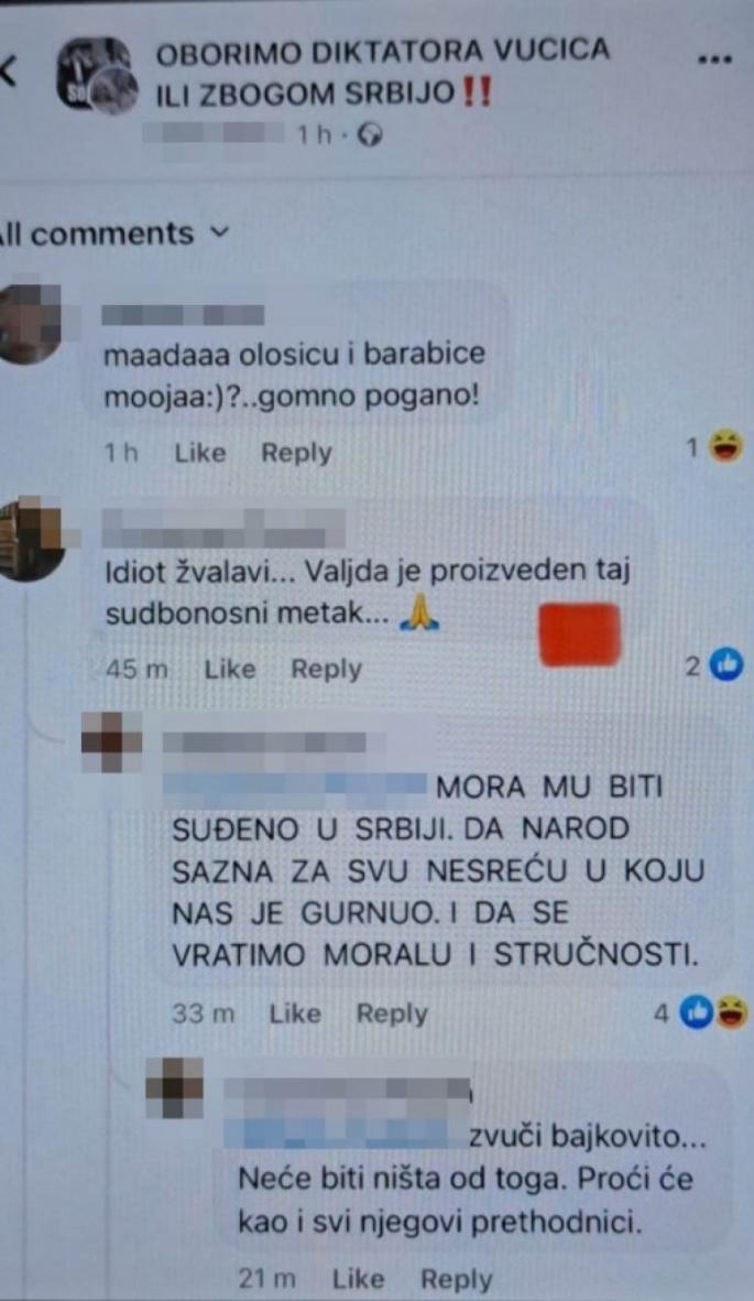Sumnja se da je uhapšeni na Fejsbuk grupi: "Oborimo diktatora Vučića ili zbogom Srbijo" napisao komentar: "Idiot žvalavi. Valjda je proizveden taj subonosni metak?".