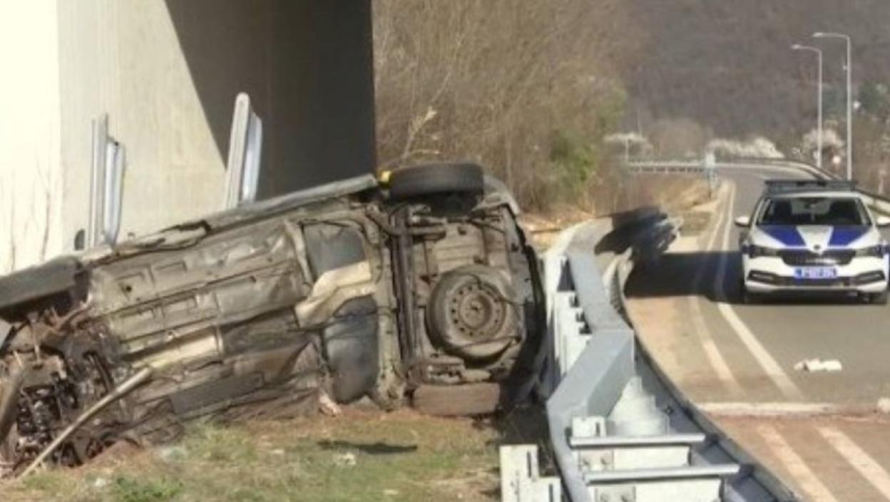 Na snimku se vidi prevrnut automobil ispod nadvožnjaka. Nije poznato da li se sudar dogodio na nadvožnjaku ili ispod njega.