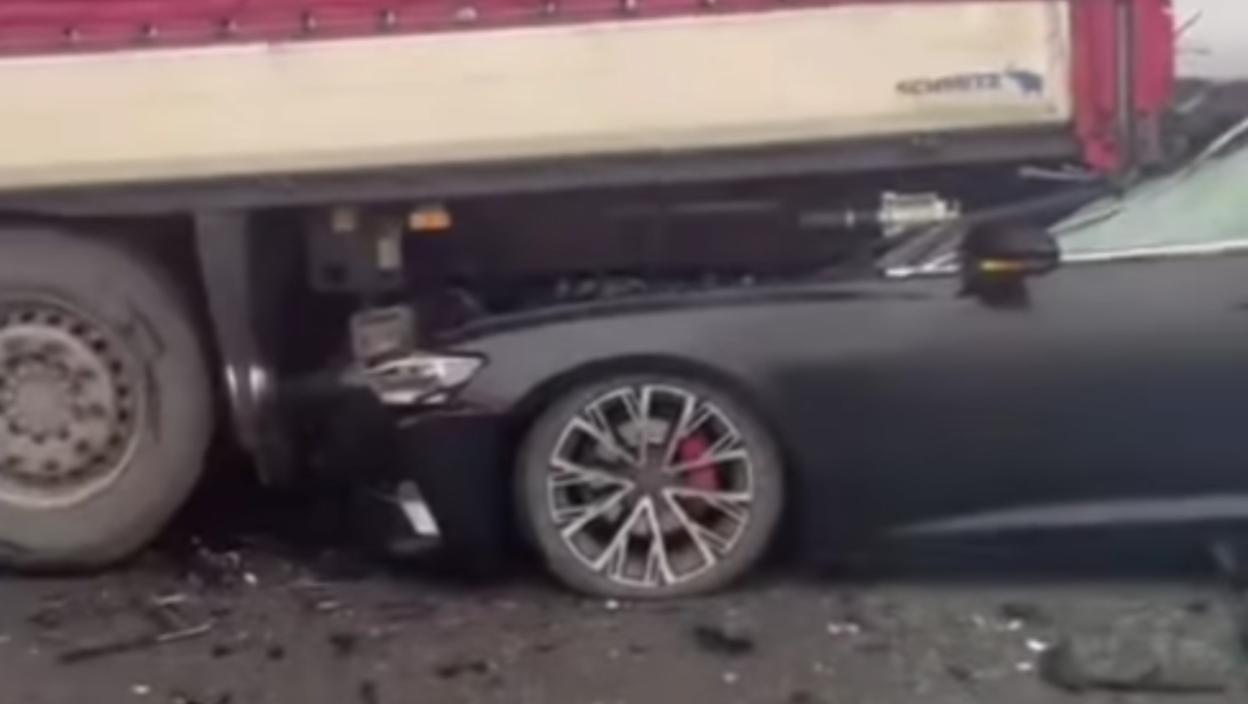 U jednom momentu može se čuti i kako zabrinuto pitaju čiji je auto, dok se na snimku vidi vozilo marke "mercedes" sa registarskim oznakama Ub, kako je sa strane udarilo u isti kamion ispod kog se nalazi "audi".