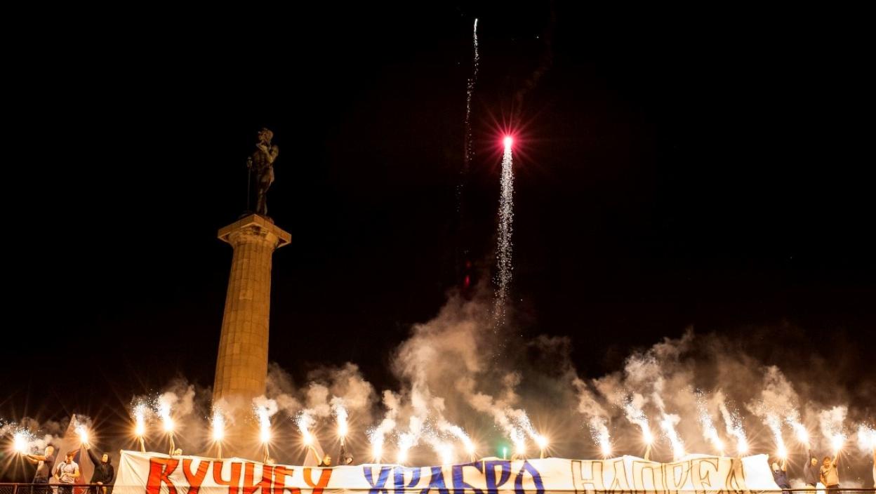 Kod spomenika Pobednik istaknut je transparent sa natpisom "Vučiću hrabro napred" koji je ispraćen velelepnim vatrometom i desetinama zapaljenih baklji.