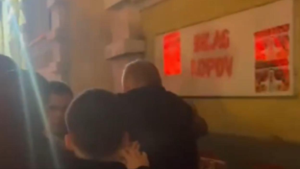 A zatim je nastavio da sa pripadnikom obezbeđenja da gura i udara omladince koji su morali da se zaštite od fizickih napada.