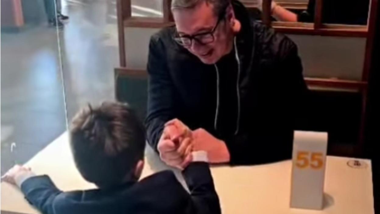 ''Vukan se danas doterao i rešio da izvede tatu u TC Galerija. Mc Donald's je njegov izbor, ali mu to nije bila najveća radost. Lepo je jeo i sa lakoćom mi oborio ruku...'', napisao je predsednik.