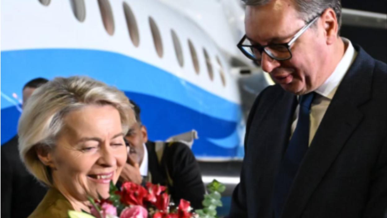 Predsednik Srbije Aleksandar Vučić dočekao je danas predsednicu Evropske komisije Ursulu fon der Lajen na aerodromu u Beogradu.