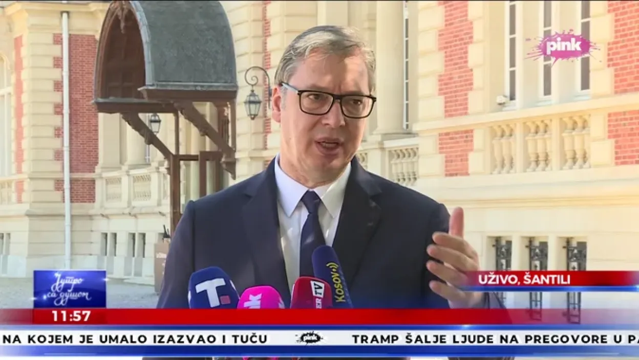 Predsednik Srbije Aleksandar Vučić obraća se novinarima nakon moćnog govora na panelu u okviru Međunarodne konferencije o globalnoj politici u Šantiliju u Francuskoj.