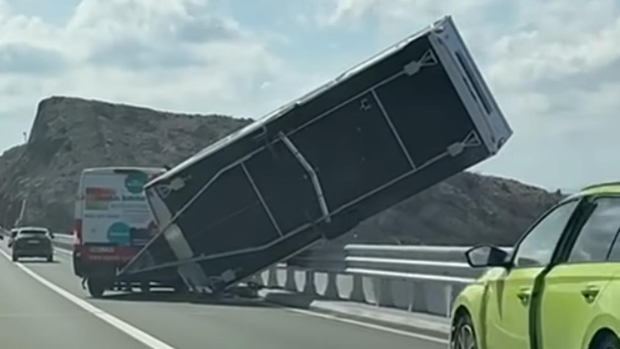 Snažni udari bure, koji su prelazili 140 kilometara na čas, izazvali su dramatičnu situaciju na Krčkom mostu, gde se kamp-prikolica prevrnula i ostala da visi na zaštitnoj ogradi.