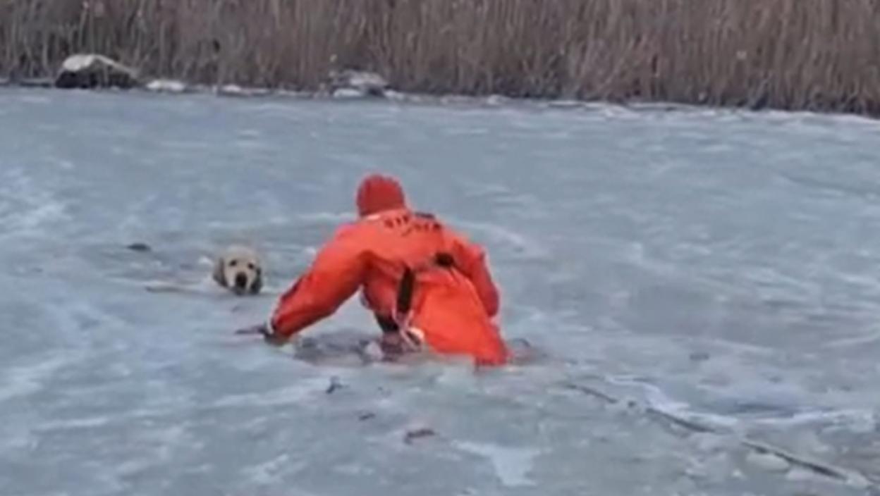 Na snimku hrabre akcije vidi se vatrogasac u zaštitnom odelu kako razbija led kako bi došao do psa. Jadni ljubimac je strpljivo čekao pomoć, dok mu je glava virila kroz led. Spasilac je čvrsto uhvatio Finiksa i polako se s njim probijao nazad ka obali.