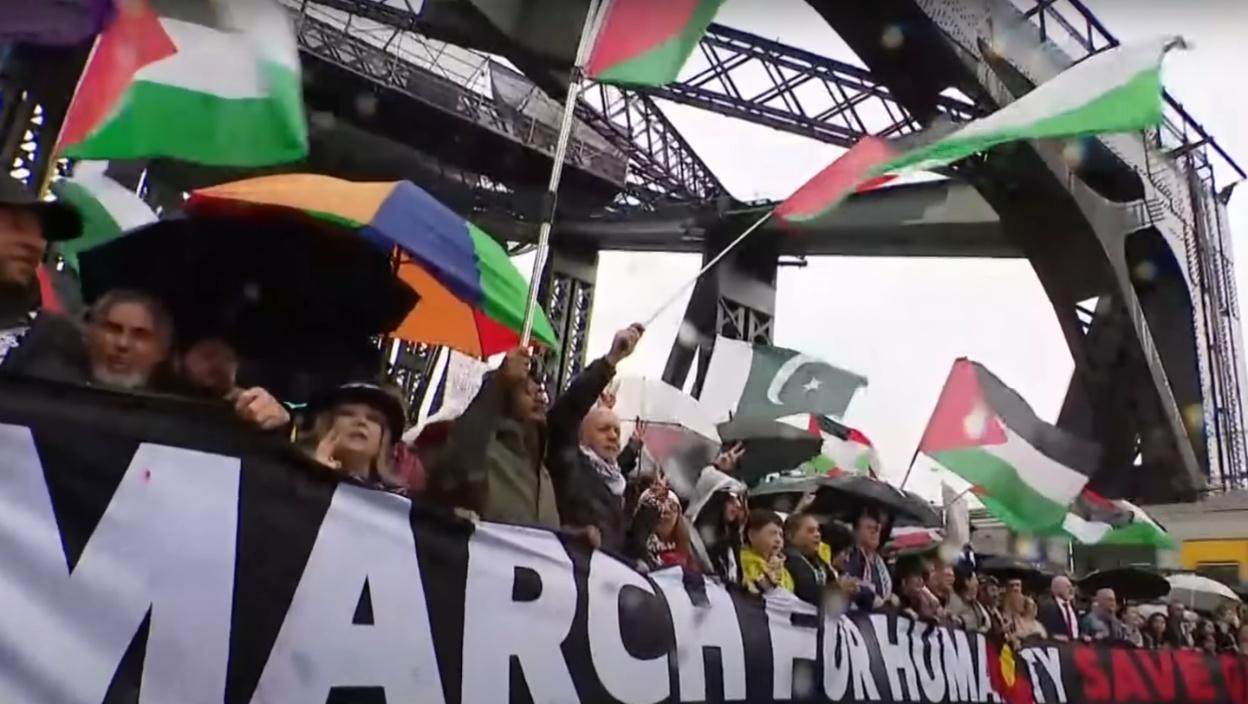 Snimci Australijske korporacije za radiodifuziju pokazali su demonstrante među kojima su mnogi nosili palestinske zastave dok su defilovali zatvorenim gradskim ulicama.