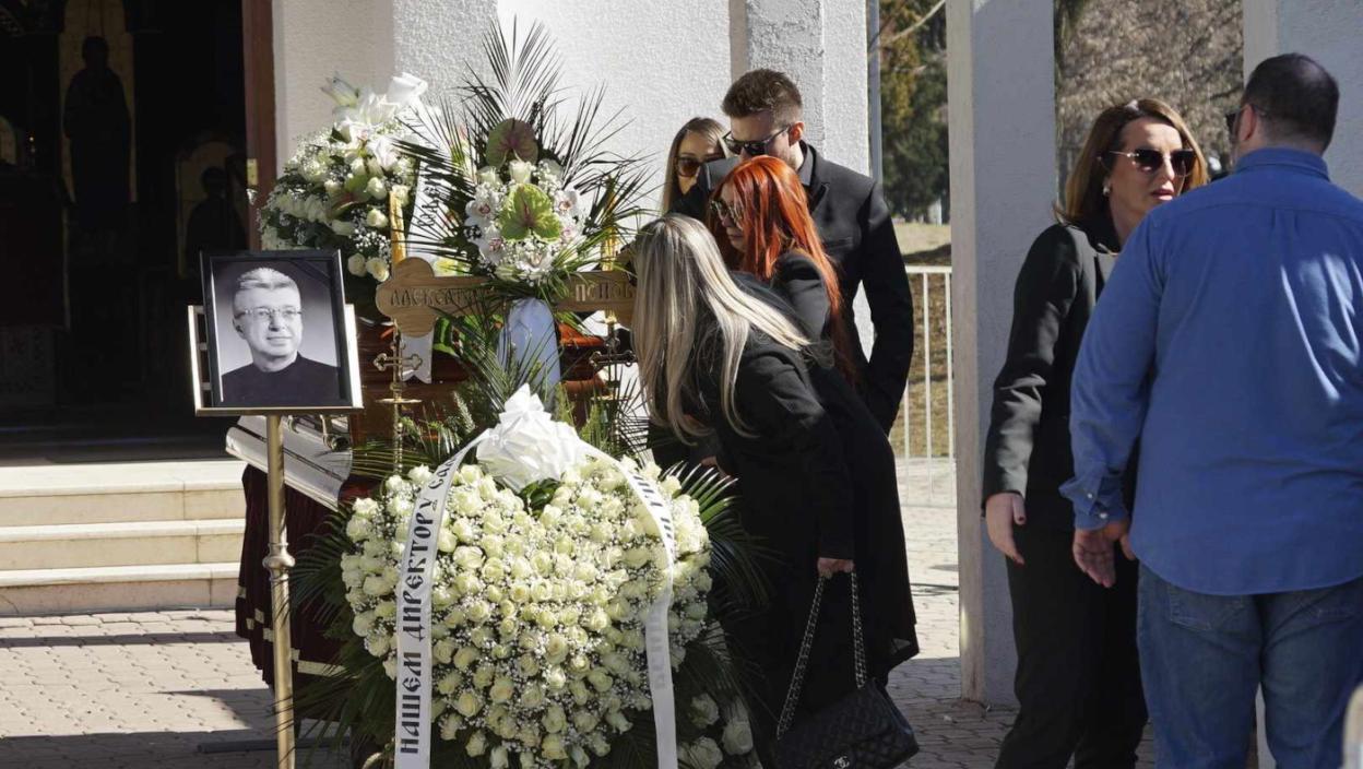 Porodica, neutešna udovica Suzana Jovanović, kćerka Aleksandra, posinak Danijel sa suprugom nalaze se ispred kovčega pokojnika.