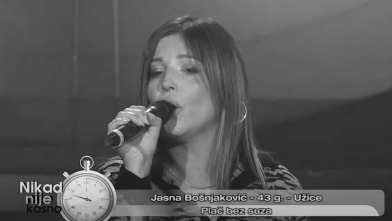 Pevačica Jasna Bošnjaković, koju je šira javnost upoznala u muzičkom takmičenju Grand produkcije "Nikad nije kasno", preminula je sinoć, 11. februara u svojoj 48. godini.