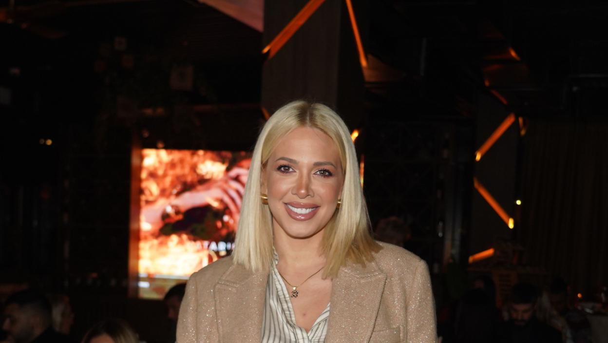 Milica je za ovu priliku odabrala komplet pantalona i sakoa u šljokicama, dok je ispod nosila usku crnu majicu koja je diskretno istakla njen trudnički stomak.