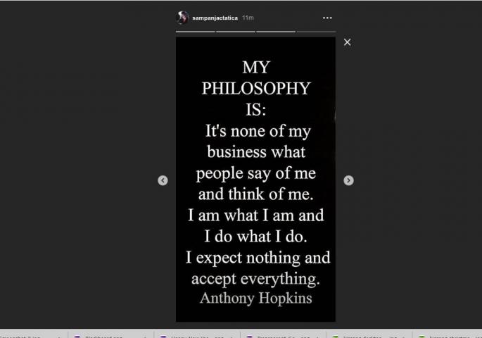 - Moja filozofija je: Ne interesuje me šta ljudi kažu i misle o meni! Ja sa šta jesam i ja radim to što radim! Ne očekujem ništa i prihvatam sve - kaže u citatu.