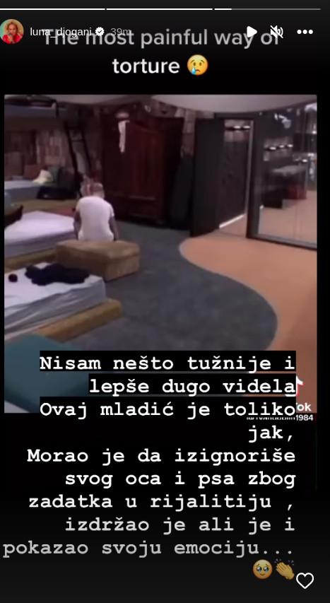 - Nisam nešto tužnije i lepše dugo videla. Ovaj mladić je toliko jak. Morao je da izignoriše svog oca i psa zbog zadatka u rijalitiju, izdržao je, ali je i pokazao svoju emociju - napisala je Luna.
