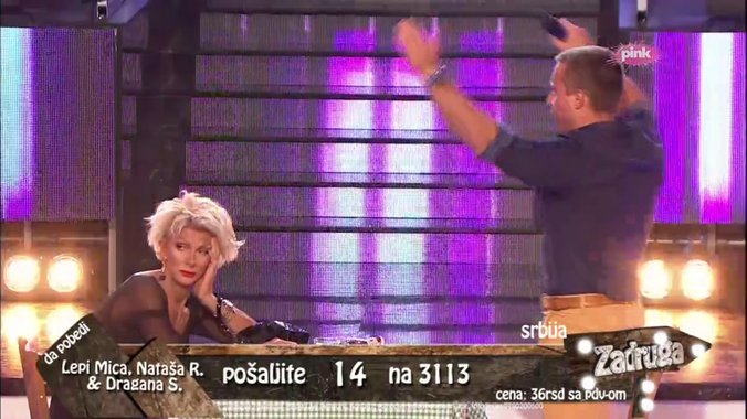 Marko Janjušević Janjuš, Mina Vrbaški, Gagi Đogani - ''Šta će mi život bez tebe dragi''. Janjuš je pevao totalno van muzike, Gagi je bio za stolom kao kafanski čovek, a Mina elegantna sa šeširom na glavi.
