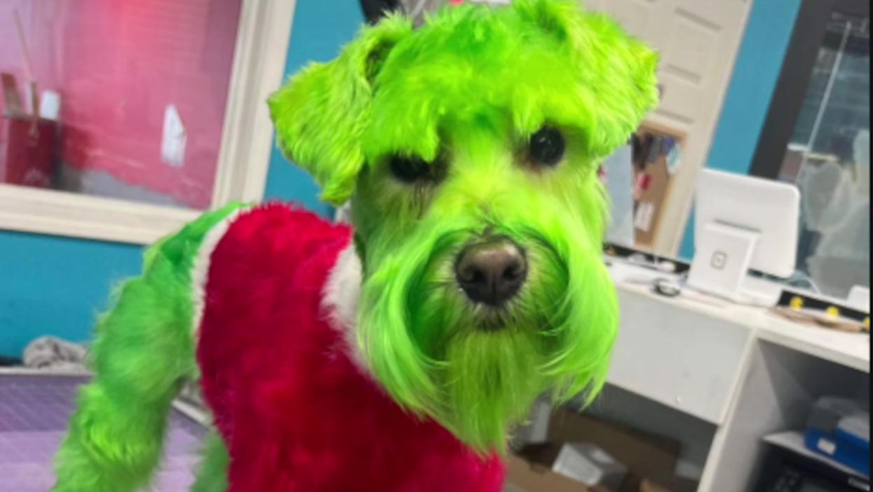 Belog minijaturnog šnaucera odvela je u salon za negu pasa, gde mu je krzno obojeno zelenom bojom, zbog čega neodoljivo podseća na popularnog lika.