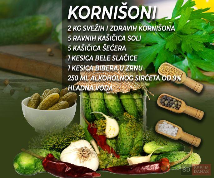 Pri kupovini kornišona, vodite računa da birate zdrave i čvrste plodove. Obavezno dobro operite i očistite od cvetova i peteljki, ako je ostalo. Možete naliti hladnu vodu i dodati 2-3 kašičice bikarbone soda i u tome da ih ostavite 10-15 minuta, a onda prospete vodu i isperete krastačiće. Nakon toga krenete sa slaganjem u tegle. Tegle i poklopce sterilišite u rerni na 100 °C oko 10 minuta.