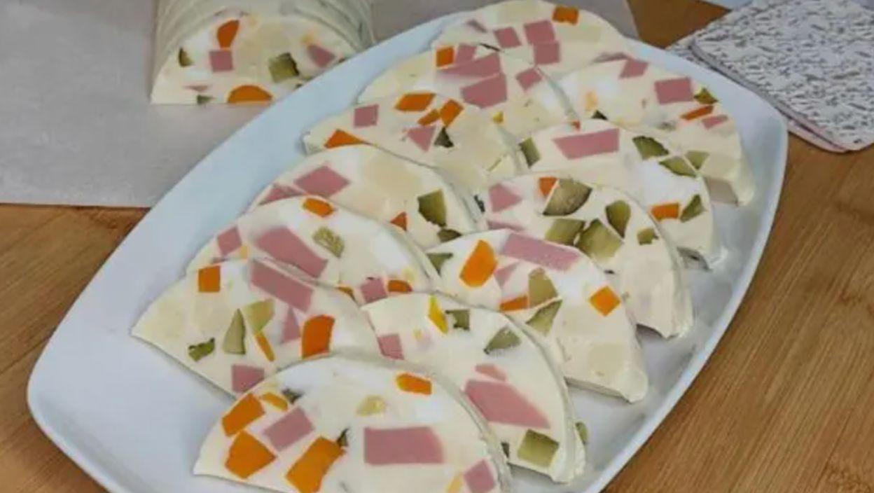 Ostavite da se hladi u frižideru dok se potpuno ne stegne. Seći na kockice i služiti.